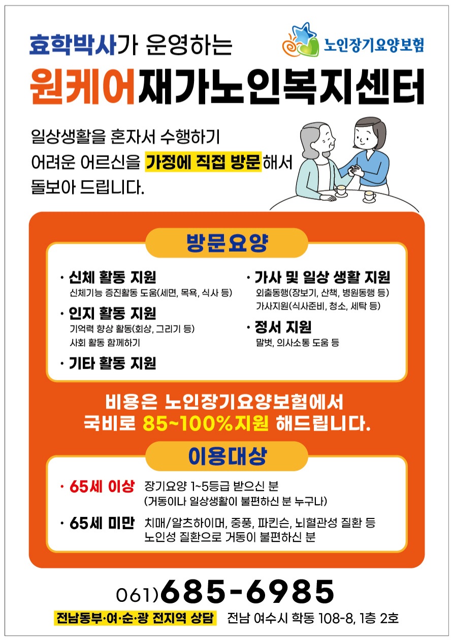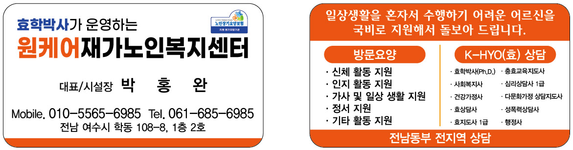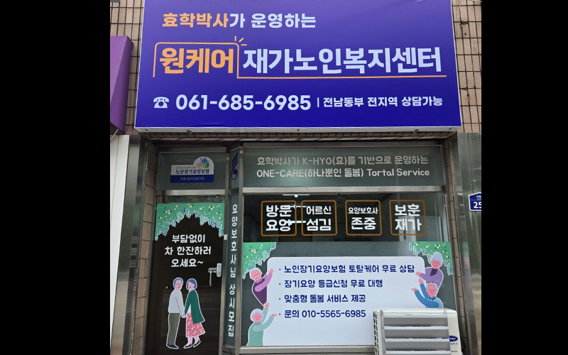 원케어재가노인복지센터    |    TEL : 061-685-6985, 010-5565-6985   |    사업자번호 : 250-80-03415